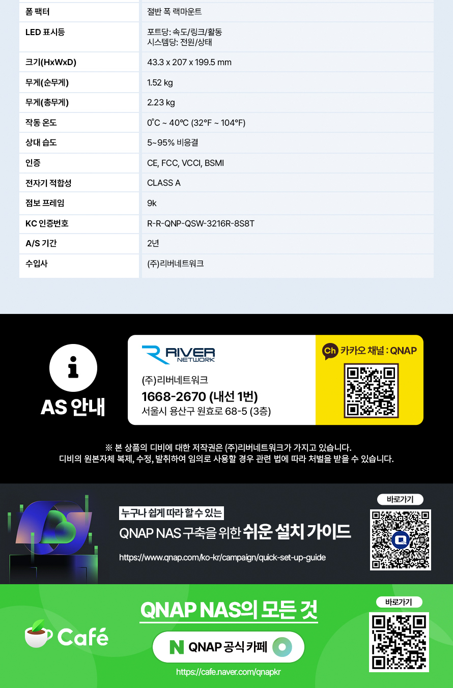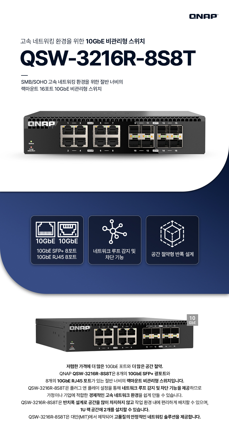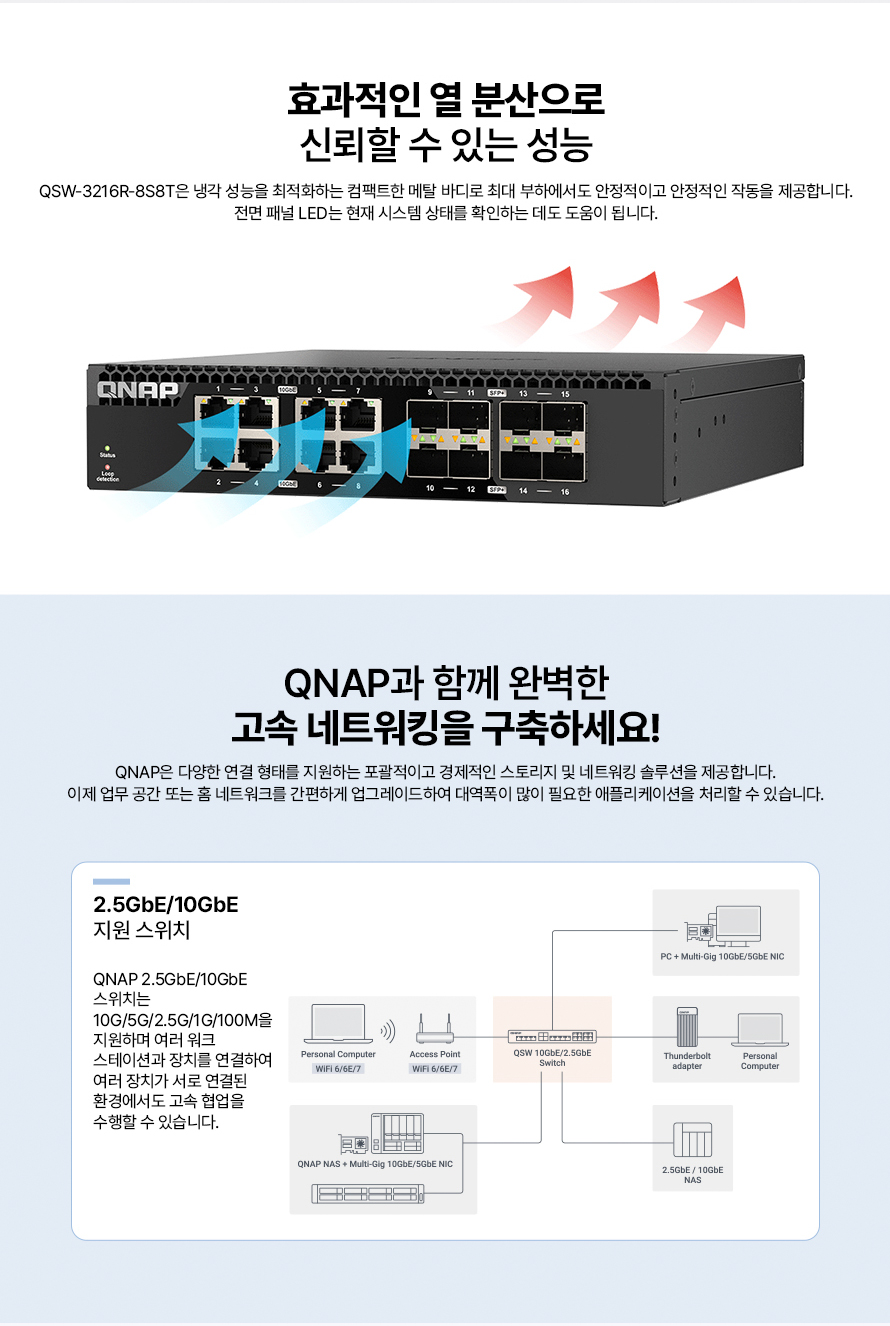 [큐냅] QNAP QSW-3216-8S8T 비관리형 스위치허브 10기가비트 16포트
